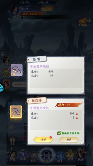 2、装上获取的各个部位装备提升战力,装备战力高的装备,被替换的会分解成升级材料。