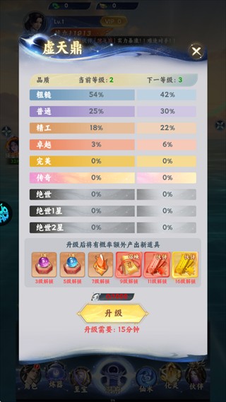 3、通过分解多余的装备材料升级虚天鼎,可以提高出现稀有装备的概率。
