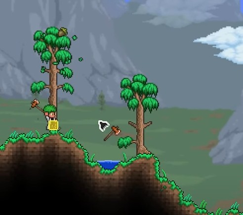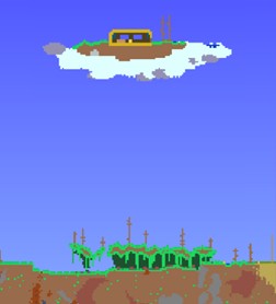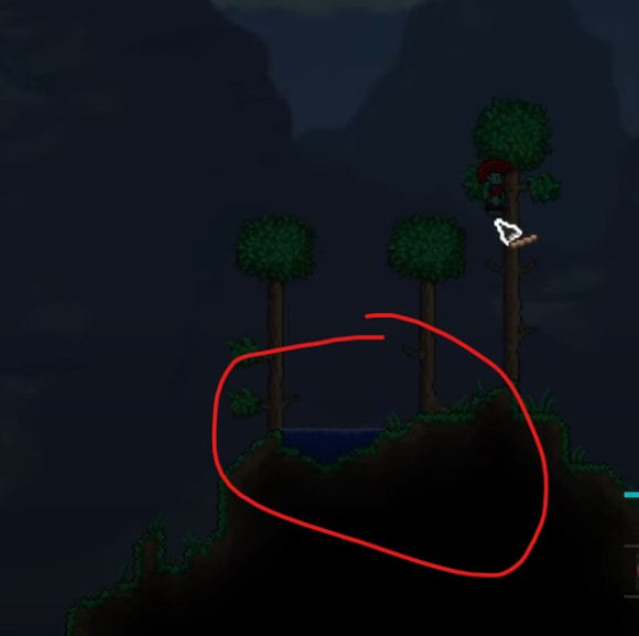 世界生成时,会有少量水从天湖/空岛中溢出,这会在空岛的下方留下一些小水坑(通常只有1~5格水)。