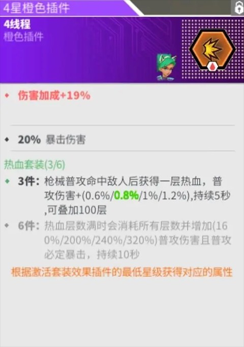 插件选6愤怒3热血,公认的目前最好插件,6愤怒不仅增加巨额暴击爆伤,还增加100%的防御,3热血也极为搭配高射速的劳拉,很快叠满100层buff。