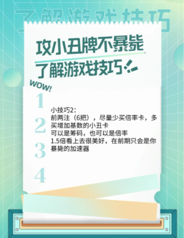 2、前两注(6把)少买倍率卡,多囤小丑卡,增加基数。1.5倍看似诱人,但前期可能会让你快速失败。