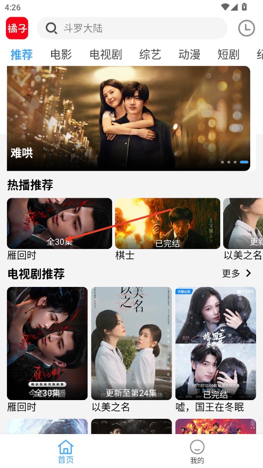1、首先用户打开橘子影视,在“首页”搜索要看的影视剧进行观看,进入播放页面。