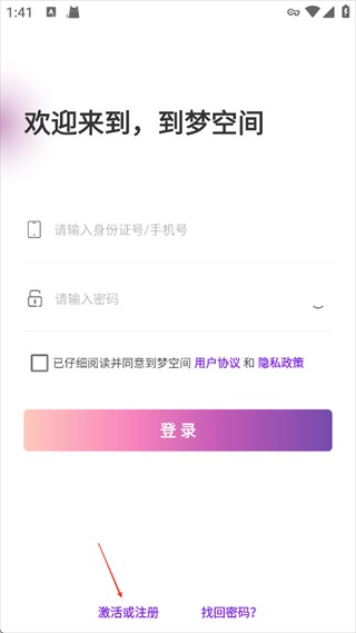 1、打开到梦空间手机版软件点击激活或注册