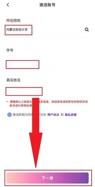 3、根据提示填写所在院校、学号、真实姓名,并完善个人信息点击下一步