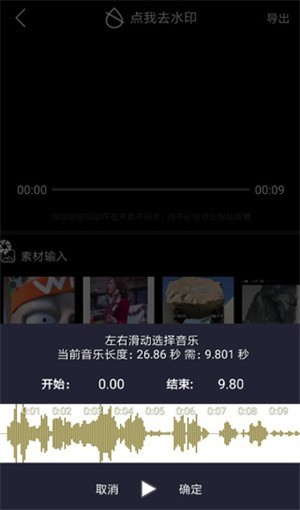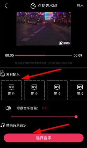 2、接下来需要滑动到下方使用“素材输入”功能,添加手机本地相册的图片素材,甚至是替换背景音乐。