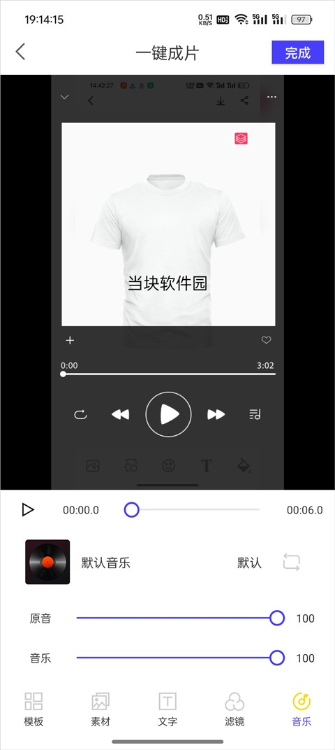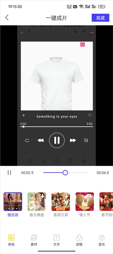 3、进入一键成片操作页面,可以在下方选择模板、素材、文字、滤镜等工具;点击【模板】,就可以在系统提供的多种视频模板中,选择自己喜欢的模板即可;