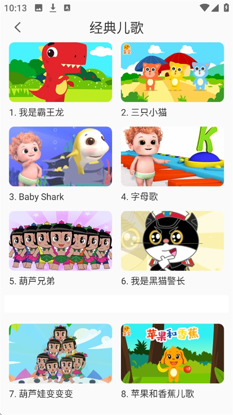 亲宝儿歌4.8.11是一款有着很多孩童启蒙类的app,在这里有着很多幼儿的歌曲和动画片,这里都有,用户可以通过各种娱乐的方式,来让你的孩子学习到更多知识的内容,一边玩耍一边进行学习,能十分有效的提升你的孩子的学习兴趣,快来下载吧。