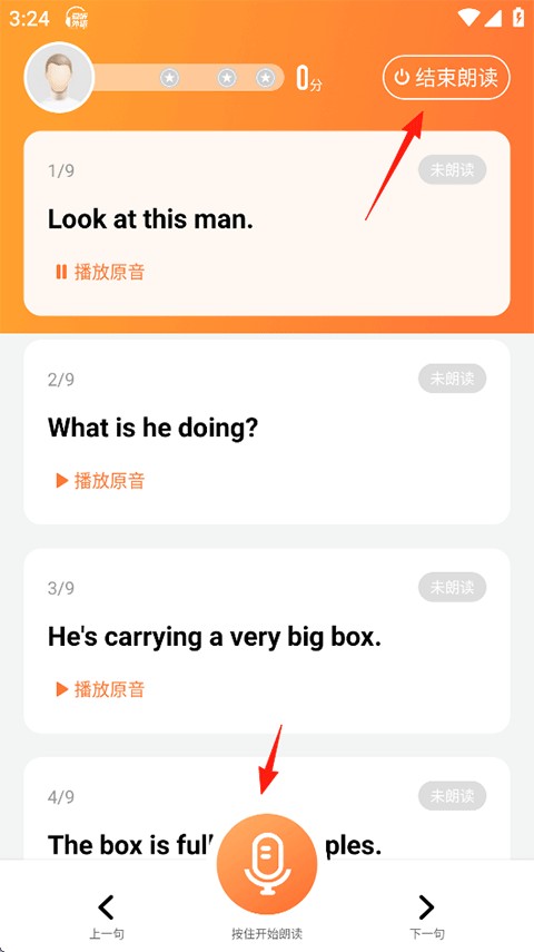 7、按住下方麦克风进行朗读,完成后点击右上角结束朗读;