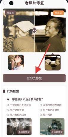 1、进入老照片修复页,点击【立即去修复】开始修复。