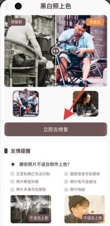 2、切换到黑白照上色页,点击【立即去修复】进行上色。