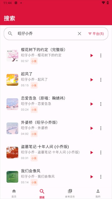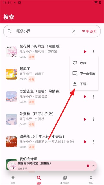 3、输入自己喜欢的歌名或者是歌手,我们以”旺仔小乔“为例