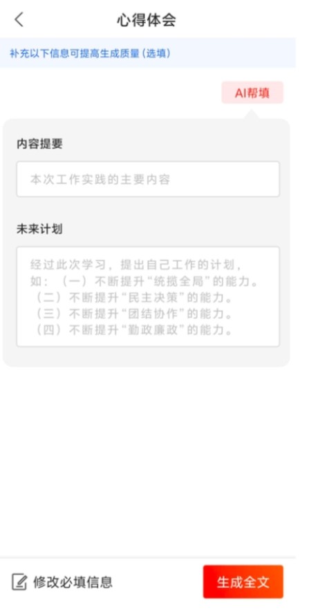 4、点击左下角补充选填信息即可进行选填信息的编辑。在心得体会的选填信息中,您可以填写内容提要、未来计划。