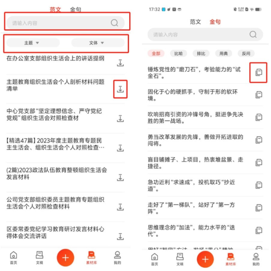 为了方便大家的写作,我们也提供了素材库的功能,点击下方素材库即可进入功能页面。素材库的范文有文体分类,您可以根据您需要的内容寻找范文。您也可以使用搜索功能,输入关键字寻找您需要的文章。在找到您需要的文章后,点击文章右侧下载按钮即可保存查看范文。除了范文外,我们还提供了不同类型的金句供您参考,对于您喜欢的金句,您可以点击金句右侧复制按键将其复制到粘贴板。