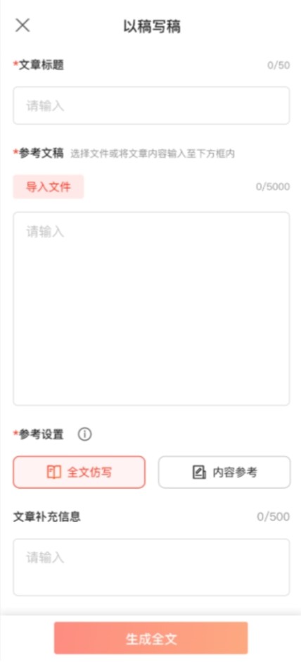 日常工作中,您可能会经常遇到这样的场景:要按照去年的工作报告结构写今年的工作报告;在材料中引用已有的行业报告数据和案例:模仿前辈写的优秀材料进行写作....只要您在文书写作中需要模仿已有文稿风格、结构、逻辑或者引用案例、数据等,都可以使用以稿写稿快速写出初稿。输入本次需要写作的文章标题,粘贴或者导入参考文章,设置参考维度,即可生成全文。
