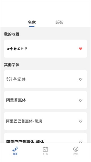 1、打开练字临帖大师免费版,在名家栏目中可以浏览并收藏喜欢的字体,点击即可学习。