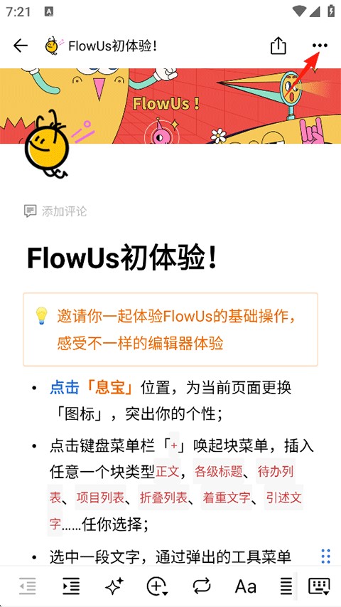 1、打开FlowUs息流正版,选择一个需要导出的页面文档并点击右上角的...扩展按钮;