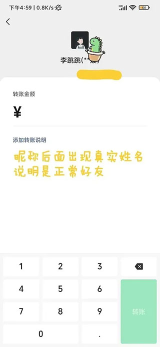 如果好友昵称后面没有出现真实姓名,则需要我们进行“假转账”,进一步确认与好友之间的关系。