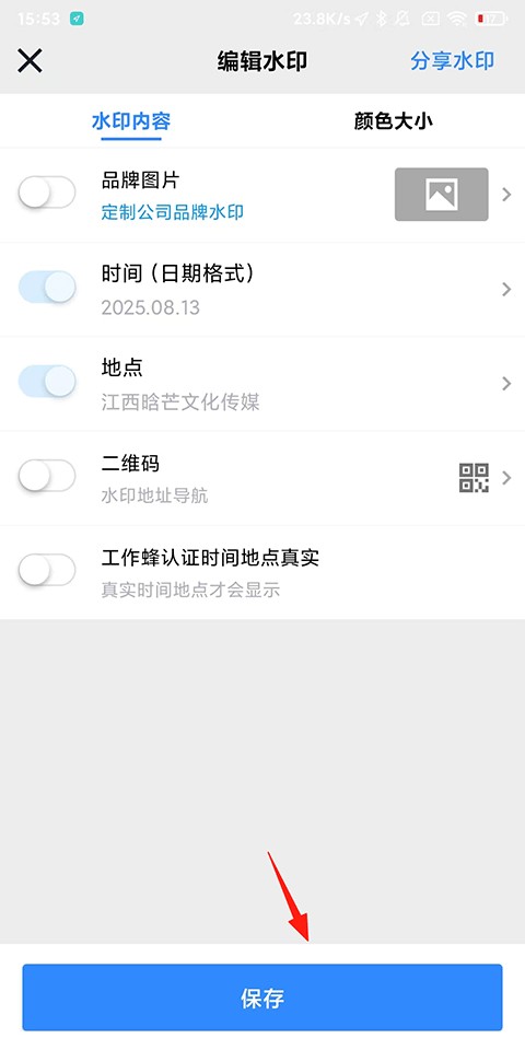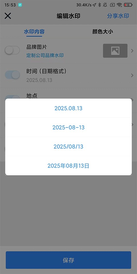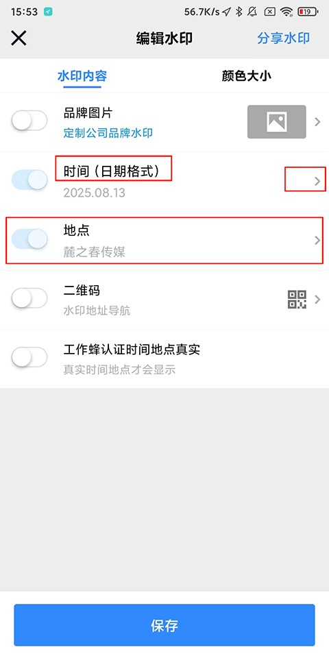 2、进入【编辑水印】页面,可以看到工作蜂水印相机不支持修改时间,只支持修改日期格式,但是在下方可以进行修改地点;