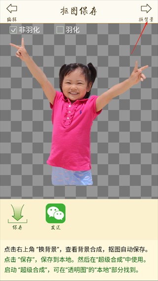 6、点击右上角【换背景】可查看背景合成效果,抠图结果会自动保存
