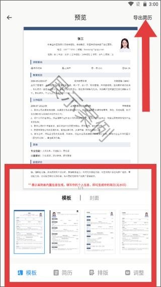 2、最美简历制作软件简历预览页面,呈现完整简历样式,可选择模板,点击导出简历进行下一步操作。