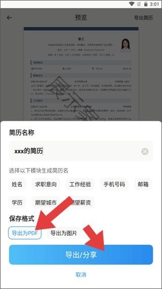 3、APP导出设置界面,可命名简历,选择保存为PDF或图片格式,点击导出分享完成操作。