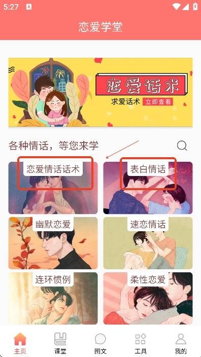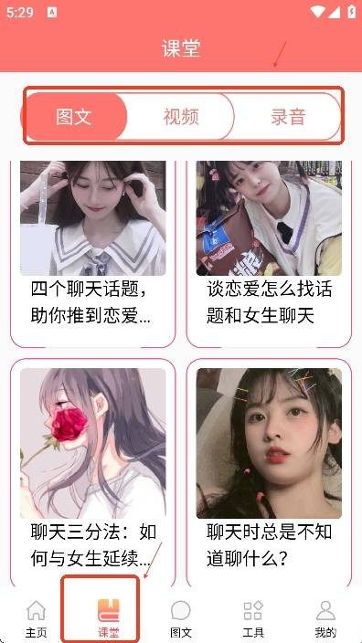 3、男生们也可以通过课堂板块的图文,视频,音频,对恋爱技巧进行更直观的学习。