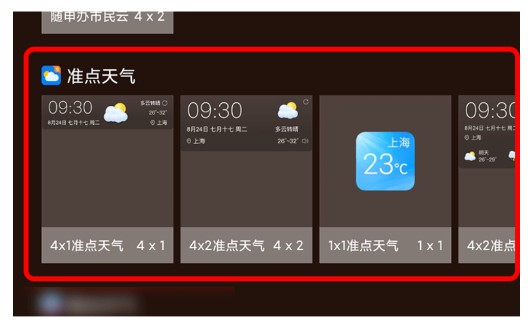 2、在小工具列表中找到“准点天气”,并选择一个尺寸;