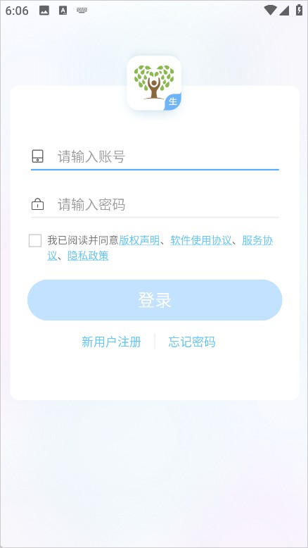1、首先我们打开学生端软件,点击登录按钮下方的新用户注册。根据提示依次输入用户名、密码、确认密码、验证码,勾选同意按钮,最后点击注册并登录。