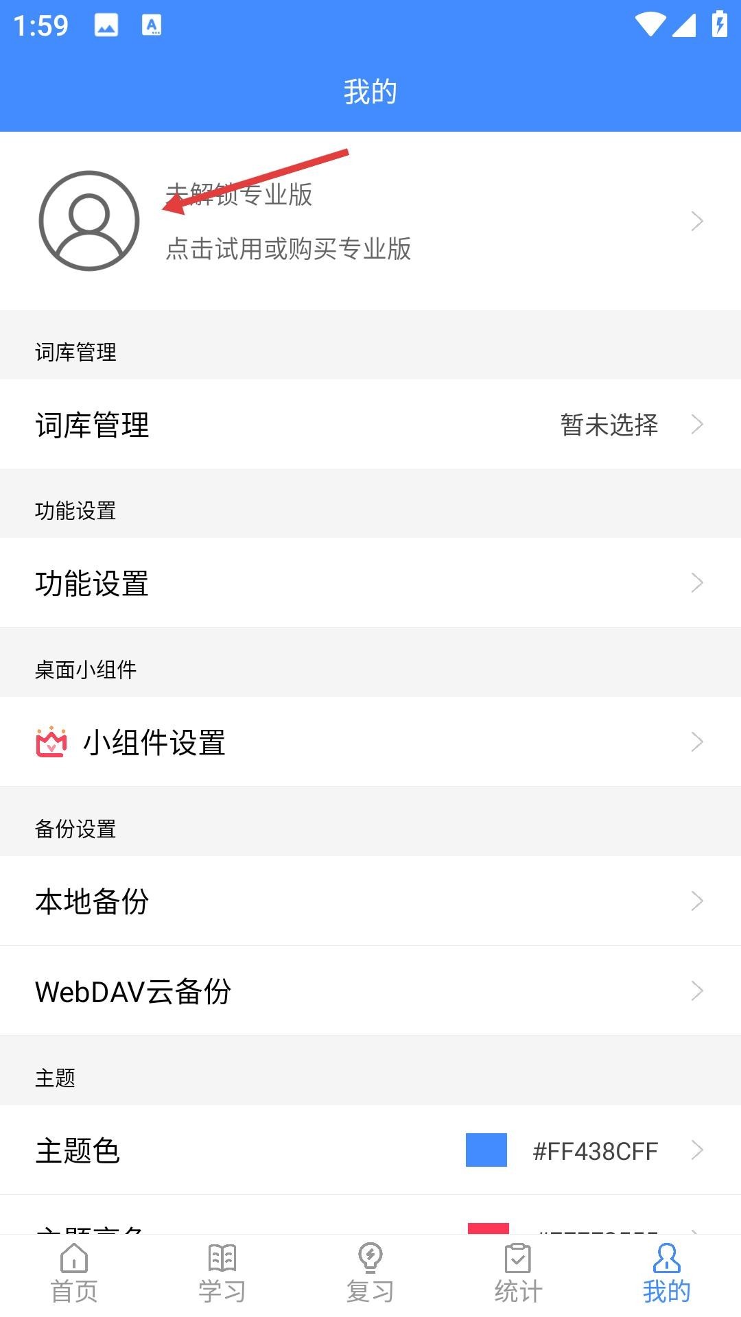 2、在我的页面,可进行词库管理、功能设置等操作,还能解锁专业版、设置桌面小组件及备份方式,个性化定制单词学习体验。