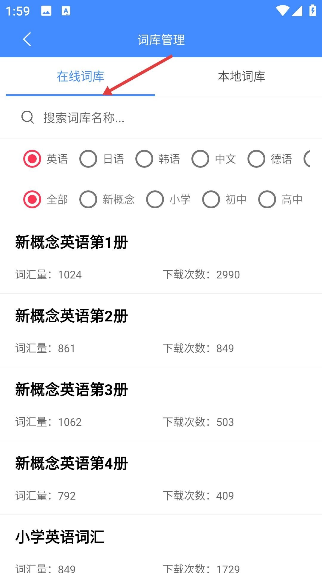 3、进入词库管理页面,有在线词库和本地词库分类,支持按语言、学段筛选,像英语的新概念系列、小学英语词汇等丰富词库,满足不同学习需求。