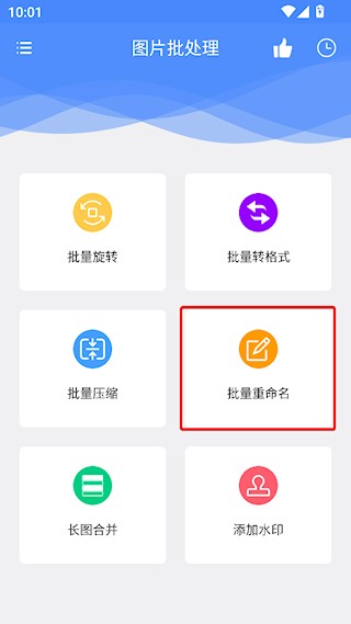 1、打开图片批处理APP,点击批量重命名功能,导入多种图片