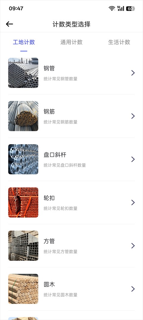 选择计数类型,拍摄或相册导入进行扫描计数,系统智能识别图片中的数量,支持计算钢管、钢筋、盘扣斜杆、轮扣、方管、圆木、方木等。