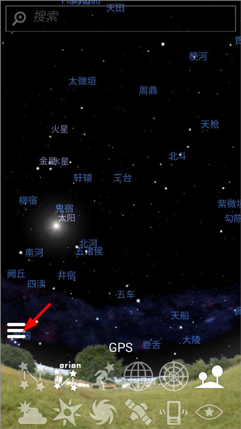 1、用户打开虚拟天文馆app,进入主页面,点击左下角“三”打开;