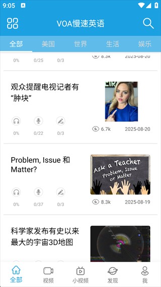 1、打开VOA慢速英语正版,在“全部”界面中选择你想听的内容选择并点击红色方框内的选项;