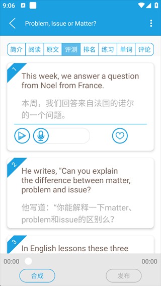 记录你的声音、分享至评论、大声秀口语口语测评、句子得分显示、单词按键显示