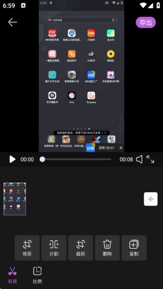 2、在视频剪辑功能中,导入本地相册视频,进入编辑页面,支持修剪、分割、裁剪等操作,还能调整比例。
