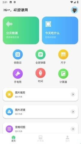 1、打开这款软件可以看到分贝检测、倒数日、全屏弹幕、图片裁剪等种类非常多的工具。