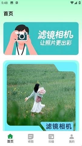 1、下载安装这款软件打开首页,就可以使用滤镜相机进行拍照了。