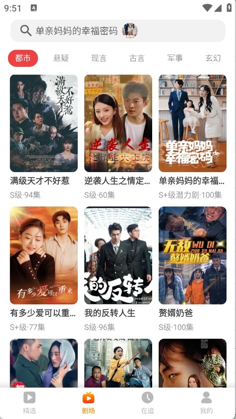 3、“剧场”页面包含了很多的短剧类型,悬疑、现言以及古言等类型。