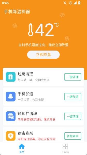 手机降温神器是一款能帮助手机降低温度解决发烫问题的工具,相信很多用户都有手机发热卡顿的情况,在游戏时发热会降低帧数,有了这款软件可以有效的降低温度提升流畅度。手机降温神器还可以清理垃圾、查杀病毒、手机加速等,支持实时监控一旦高温会自动启动降低温度,有需要的用户赶快下载使用吧。