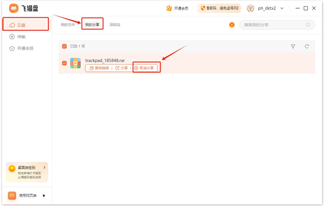 1、进入“飞猫盘”,选择自己需要分享的文件,直接选择分享。