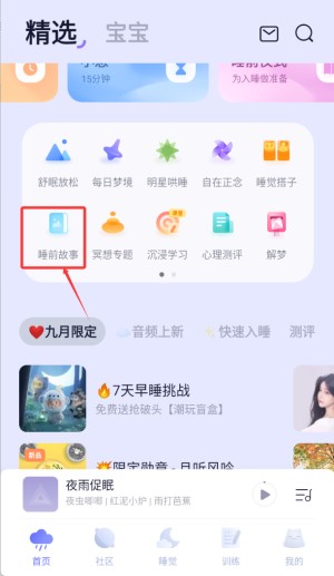 3、选择睡前故事音频助眠,包含儿童寓言与成人放松叙事类型。