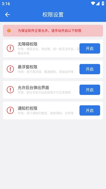1、在东快软件站下载安装好自动连点小手,首次使用需要开启需要的全部权限,依次开启无障碍权限、悬浮窗权限、允许后台弹出界面。