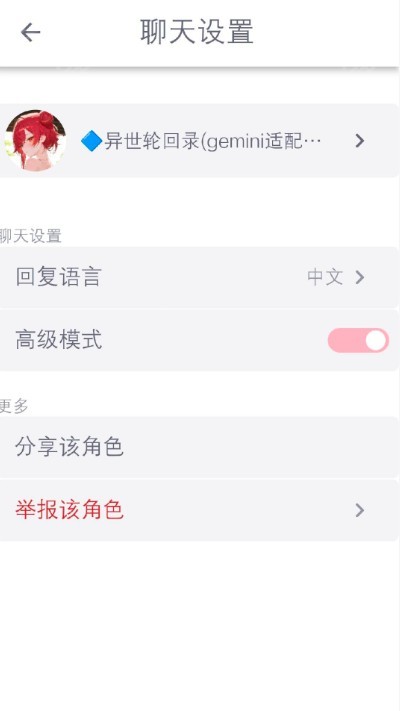9、此外还可以点击右上角的三个点进入聊天设置页面,在这里可以设置回复语言、开启高级模式。