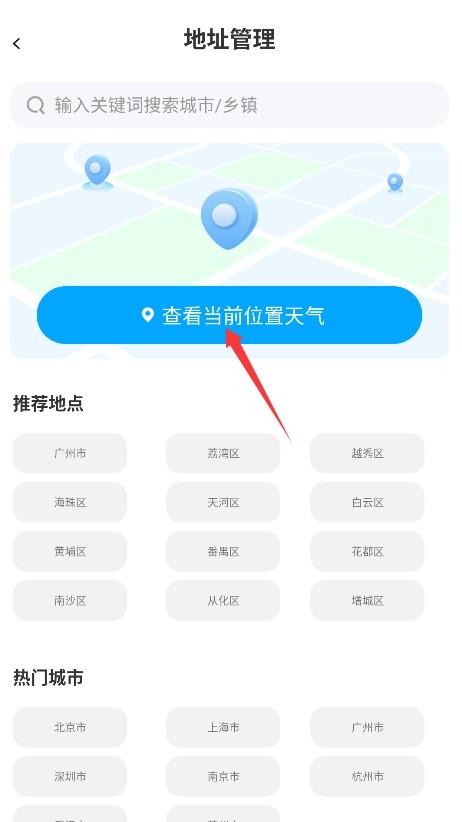 2、开启手机定位功能自动获取当地天气,或在管理页面手动输入需要查询的城市名称。