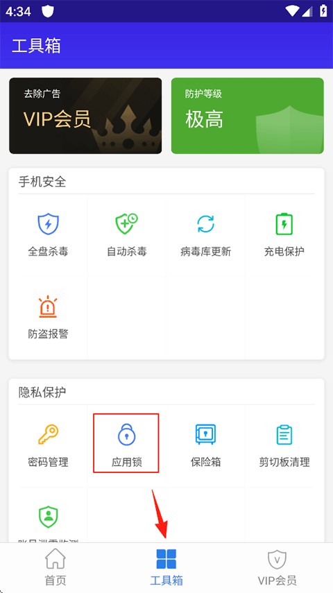 1、打开猎豹安全大师官方版,点击工具箱-隐私保护-应用锁;