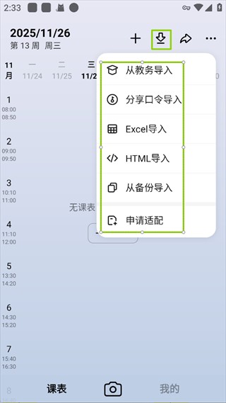 1、打开WakeUp课程表旧版,点击右上角【下载】图标,选择导入方式【支持从教务、分享口令、Excel 等多方式导入】。