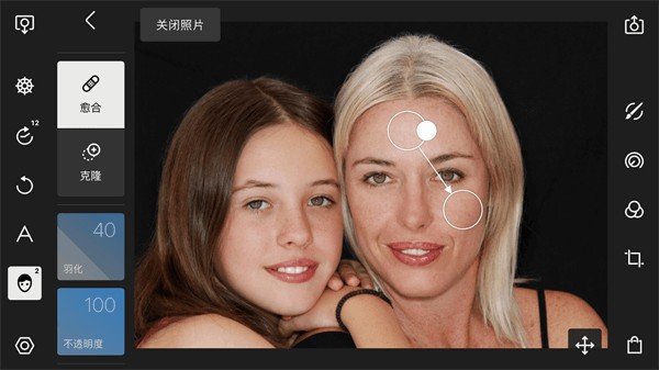 当新建一个点去除之后,画面中会出现两个圆圈,其中带有一个实心圆圈的为“源区域”,而不带有实心圆圈的为“目标区域”,瑕疵修复工具即是利用“源区域”去修复“目标区域”。