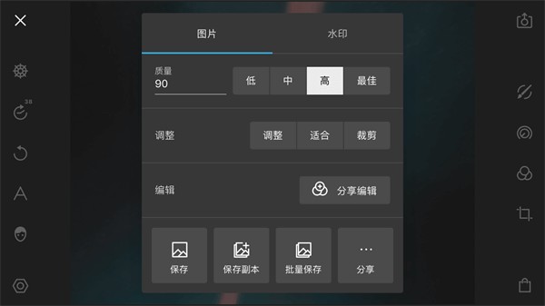 泼辣修图右上角的图标为导出按钮,通过这里可以设置图片的导出质量、图片的导出尺寸等选项。