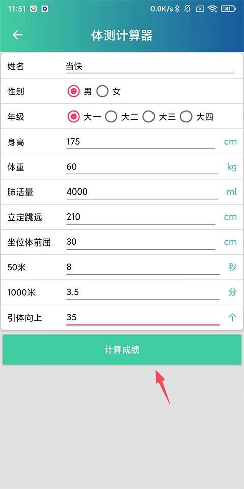 3、输入相关信息,如姓名、性别、年级、身高、体重等,点击计算成绩;